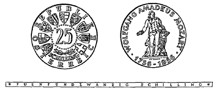 Die Münzen sind aus einer Legierung von 800 Tausendteilen Silber und 200 Tausendteilen Kupfer hergestellt; sie haben einen Durchmesser von 30 mm und ein Rauhgewicht von 13 g, enthalten somit 10'4 g Feinsilber. Abweichungen hievon dürfen im Feingehalt fünf Tausendstel und im Gewicht zehn Tausendstel nicht übersteigen. Die eine Seite zeigt den Tondichter Wolfgang Amadeus Mozart in Vorderansicht bei einem Notenpult stehend, ferner am Rand kreisförmig angeordnet die Umschrift „Wolfgang Amadeus Mozart“ und die Jahreszahl „1756“ und „1956“. Die andere Seite trägt in der Mitte die Ziffer „25“, darunter einen Lorbeerzweig und das Wort „Schilling“, umgeben von den Wappen der neun Bundesländer und der Umschrift „Republik Österreich“. Die innere Einfassung besteht auf beiden Seiten aus einem flachen Stäbchen. Der Rand der Münze ist glatt und trägt die vertiefte Inschrift „Fünfundzwanzig Schilling“.