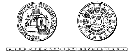 Die Münzen sind aus einer Legierung von 800 Tausendteilen Silber und 200 Tausendteilen Kupfer hergestellt; sie haben einen Durchmesser von 30 mm und ein Rauhgewicht von 13 g, enthalten somit 10'4 g Feinsilber. Abweichungen hievon dürfen im Feingehalt 5/1000 und im Gewicht 10/1000 nicht übersteigen. Die eine Seite zeigt die Haydnkirche in Eisenstadt mit der kreisförmigen Umschrift „40 Jahre Burgenland“ und die Jahreszahlen „1921-1961“. Die andere Seite zeigt in der Mitte die Ziffer „25“, darunter zwei Lorbeerzweige und das Wort „Schilling“, umgeben von den Wappen der neun Bundesländer und der Umschrift „Republik Österreich“. Die innere Einfassung besteht auf beiden Seiten aus einem flachen Stäbchen. Der Rand der Münze ist glatt und trägt die vertiefte Inschrift „Fuenfundzwanzig Schilling“.