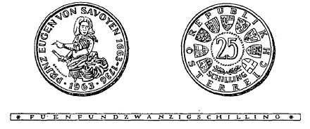 Die Münzen sind aus einer Legierung von 800 Tausendteilen Silber und 200 Tausendteilen Kupfer hergestellt; sie haben einen Durchmesser von 30 mm und ein Rauhgewicht von 13 g, enthalten somit 10'4 g Feinsilber. Abweichungen hievon dürfen im Feingehalt 5/1000 und im Gewicht 10/1000 nicht übersteigen. Die eine Seite zeigt das Brustbild des Prinzen Eugen von Savoyen in Ritterrüstung nach einer zeitgenössischen Abbildung, umgeben von der kreisförmigen Umschrift „Prinz Eugen von Savoyen“ und den Jahreszahlen „1663 - 1736 - 1963“. Die andere Seite zeigt in der Mitte die Zahl „25“, darunter zwei Lorbeerzweige und das Wort „Schilling“, umgeben von den Wappen der neun Bundesländer und der Umschrift „Republik Österreich“. Die innere Einfassung besteht auf beiden Seiten aus einem flachen Stäbchen. Der Rand der Münze ist glatt und trägt die vertiefte Inschrift „Fuenfundzwanzig Schilling“.
