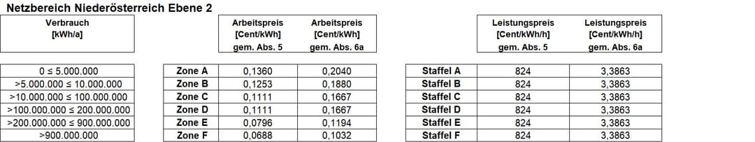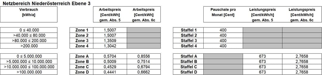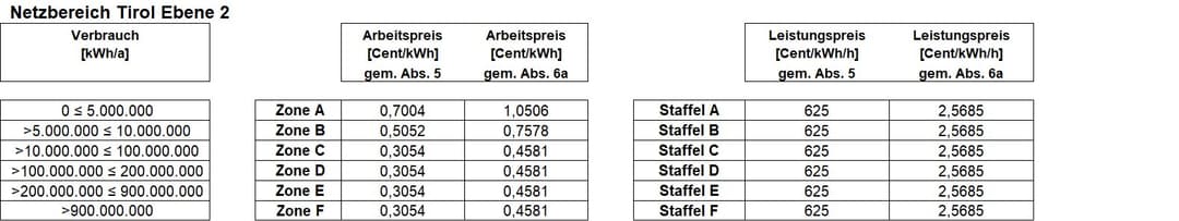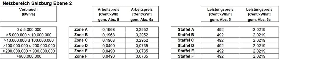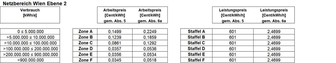 (4) Die Entgelte werden verbrauchs- und leistungsabhängig in Zonen bzw. Staffeln festgelegt. Die Zonen 1-4 sowie die Staffeln 1-4 kommen für nicht leistungsgemessene Anlagen, die Zonen A-F sowie die Staffeln A-F kommen für leistungsgemessene Anlagen zur Anwendung. Der Arbeitspreis wird für die Zonen 1-4 bzw. A-F so festgelegt, dass je nach Jahresverbrauch alle darunter liegenden Zonen durchlaufen werden. Der Leistungspreis wird in den Staffeln A-F bzw. 1-4 festgelegt, wobei der Leistungspreis der Staffel 1-4 als Pauschale bestimmt wird. Die Pauschalen der Staffeln 1-4 sind grundsätzlich auf einen Zeitraum von einem Monat zu beziehen. Ist der Abrechnungszeitraum kürzer oder länger als ein Monat, sind die Pauschalen der Staffeln 1-4 tageweise zu aliquotieren. Es können Zonen bzw. Staffeln zusammengefasst werden, sodass mehrere Zonen bzw. Staffeln denselben Arbeitspreis bzw. denselben Leistungspreis aufweisen können. Die Rechnungslegung hat entsprechend den tatsächlichen Ableseintervallen (§ 15 Abs. 3) zu erfolgen, § 126 Abs. 2 GWG 2011 bleibt davon unberührt.