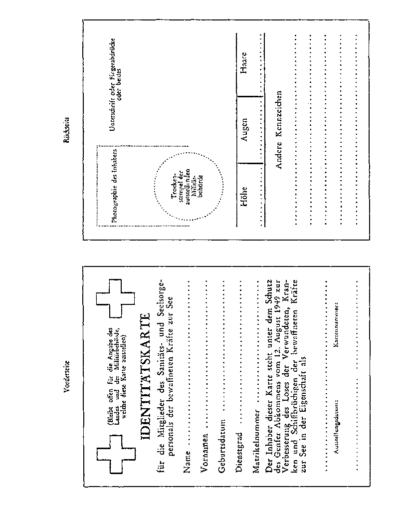 In jeder Armee sollen die Identitätskarten einheitlich und in den Armeen der Hohen Vertragschließenden Parteien soweit als möglich nach gleichem Muster gestaltet sein. Die am Konflikt beteiligten Parteien können sich an das dem vorliegenden Abkommen beigefügte Muster halten. Bei Beginn der Feindseligkeiten sollen sie einander das von ihnen verwendete Muster bekanntgeben. Jede Identitätskarte soll, wenn möglich, in mindestens zwei Exemplaren ausgefertigt werden, wovon eines vom Heimatstaat aufbewahrt wird.