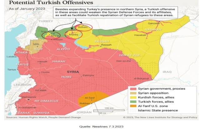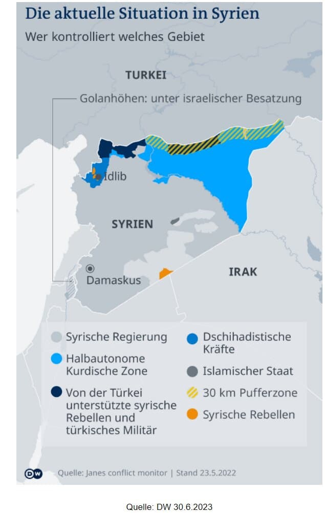 Alaraby - New Arab, the (31.5.2023): Why Syria's Kurds and Hayat Tahrir al-Sham are offering to host refugees, https://www.newarab.com/analysis/why-syrias-kurds-and-hts-are-offering-host-refugees, Zugriff 28.6.2023
