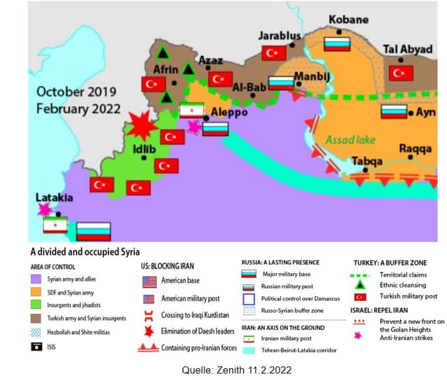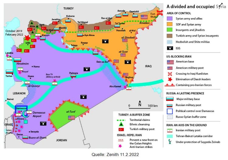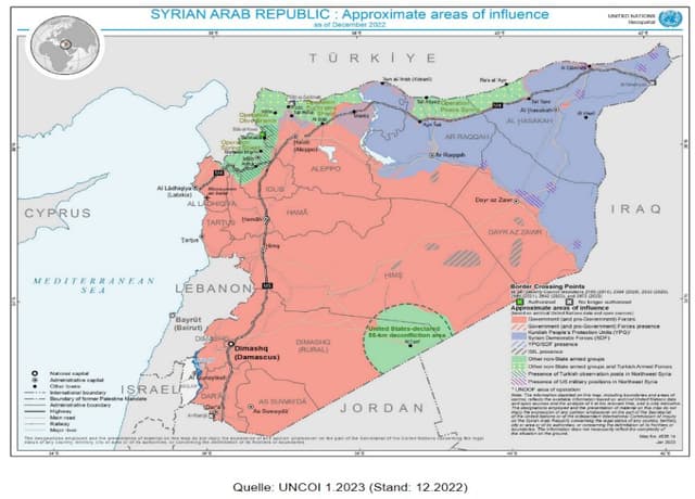 Die Entscheidung Moskaus, 2015 in Syrien militärisch zu intervenieren, hat das Assad-Regime in Damaskus effektiv geschützt. Russische Luftstreitkräfte und nachrichtendienstliche Unterstützung sowie von Iran unterstützte Milizen vor Ort ermöglichten es dem Regime, die Opposition zu schlagen und seine Kontrolle über große Teile Syriens brutal wiederherzustellen. Seit März 2020 scheint der Konflikt in eine neue Patt-Phase einzutreten, in der drei unterschiedliche Gebiete mit statischen Frontlinien abgegrenzt wurden (IPS 20.5.2022). Das Assad-Regime kontrolliert rund 70 % des syrischen Territoriums. Seit dem Höhepunkt des Konflikts, als das Regime - unterstützt von Russland und Iran - unterschiedslose, groß angelegte Offensiven startete, um Gebiete zurückzuerobern, hat die Gewalt deutlich abgenommen. Auch wenn die Gewalt zurückgegangen ist, kommt es entlang der Konfliktlinien im Nordwesten und Nordosten Syriens weiterhin zu kleineren Scharmützeln. Im Großen und Ganzen hat sich der syrische Bürgerkrieg zu einem internationalisierten Konflikt entwickelt, in dem fünf ausländische Streitkräfte - Russland, Iran, die Türkei, Israel und die Vereinigten Staaten - im syrischen Kampfgebiet tätig sind und Überreste des Islamischen Staates (IS) regelmäßig Angriffe durchführen (USIP 14.3.2023).