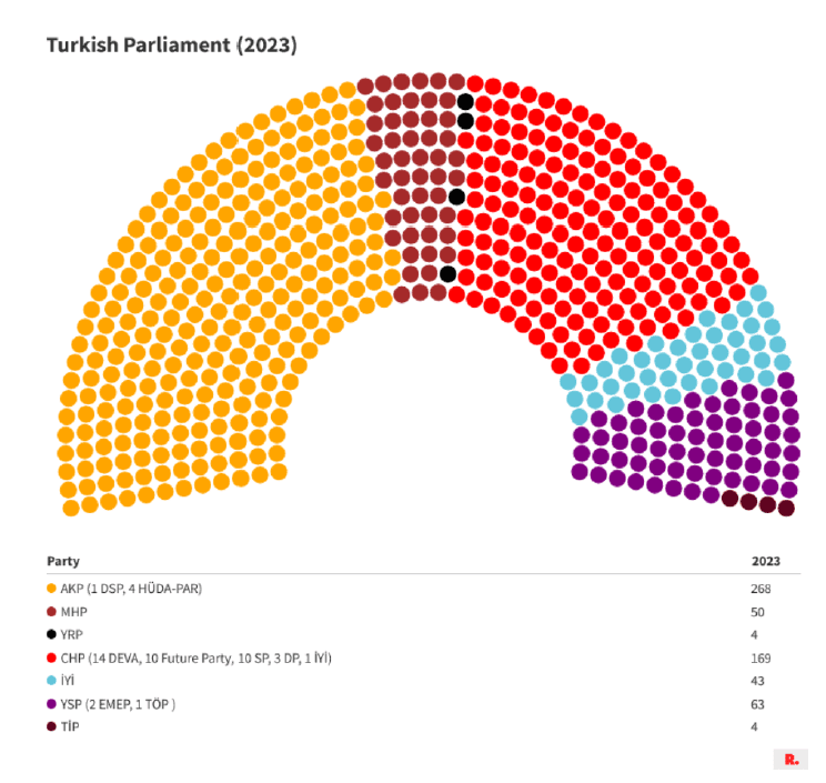 In der neu gewählten Nationalversammlung sitzen zusätzlich Vertreter und Vertreterinnen mehrer Kleinparteien, welche auf den Listen der AKP, der CHP und er YSP standen. So entfallen von den 268 Sitzen der AKP vier auf die kurdisch-islamistische Partei der Freien Sache, Hür Dava Partisi - HÜDA-PAR und ein Sitz auf die Demokratische Linkspartei, Demokratik Sol Parti - DSP. Von den 149 Mandaten der CHP gehören 14 der Partei für Demokratie und Fortschritt, Demokrasi ve Atılım Partisi - DEVA [des ehemaligen Wirtschaftsministers Ali Babacan], zehn der Zukunftspartei, Gelecek Partisi - GP [des ehemaligen Ministerpräsidenten Ahmet Davutoğlu] und weitere zehn der islamisch-konservativen Partei der Glückseligkeit, Saadet Partisi -SP und drei der Demokratischen Partie, Demokrat Parti - DP. Über die CHP-Liste bekam die ansonsten eigenständig kandidierende İYİ-Partei zu ihren 43 Sitzen noch einen Sitz dazu. Über die Listen der Links-Grünen Partei erhielten die Partei der Arbeit, Emek Partisi - EMEP zwei sowie die Partei der Sozialen Freiheit, Toplumsal Özgürlük Partisi - TÖP eines der YSP-Mandate [Anm.: die Zahl der YSP von 63 in der Grafik entspricht nicht jener des amtlichen Wahlresultats von 61 Mandataren] (Duvar 18.5.2023, vgl. BIRN 19.5.2023), was mit den übrigen 58 YSP die offiziellen 61 Parlamentarier ergibt (BIRN 19.5.2023).
