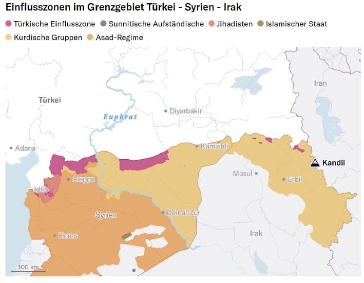 Zuletzt kam es im Dezember 2023 und Jänner 2024 zu einer Eskalation. - Am 12.1.2024 wurden bei einem Angriff der PKK auf eine türkische Militärbasis im Nordirak neun Soldaten getötet. Ende Dezember 2023 waren bei einer ähnlichen Aktion zwölf Armeeangehörige ums Leben gekommen. Die türkische Regierung berief umgehend einen Krisenstab ein und holte, wie stets in solchen Fällen, zu massiven Vergeltungsschlägen aus. Bis zum 17.1.2024 waren laut Verteidigungsministerium mehr als siebzig Ziele durch Luftangriffe zerstört worden. Die Türkei beschränkte ihre Vergeltungsaktionen nicht auf den kurdischen Nordirak, sondern griff auch Positionen der SDF sowie Infrastruktureinrichtungen im Nordosten Syriens an. Ankara betrachtet die SDF und vor allem deren wichtigste Einheit, die kurdisch dominierten Volksverteidigungseinheiten (YPG), als Arm der PKK und somit als Staatsfeind (NZZ 18.1.2024; vgl. RND 14.1.2024).