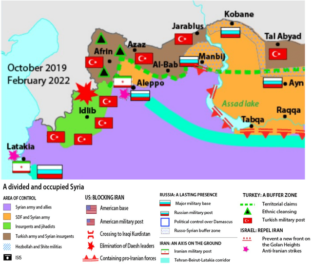 Die folgende Karte zeigt die verschiedenen internationalen Akteure und deren militärische Interessenschwerpunkte in Syrien:
