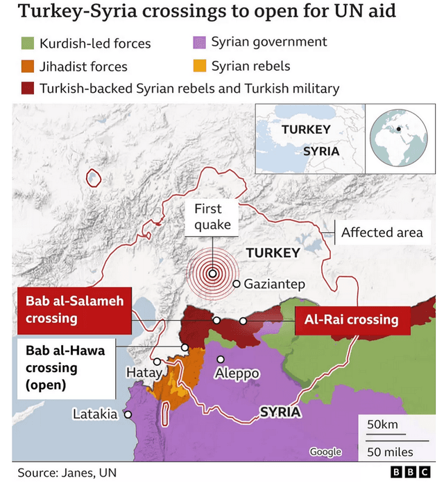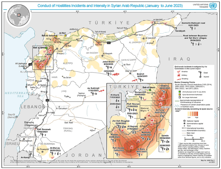 Im Februar 2023 wurde die Region von verheerenden Erdbeben heimgesucht, bei denen Tausende von Menschen ums Leben kamen [Anm.: s. Karte des betroffenen Gebiets samt Gebietskontrolle unten] (AJ 15.3.2023). Daraufhin wurde in Nordsyrien ein signifikanter, wenn auch zeitlich begrenzter, Rückgang der Kampfhandlungen verzeichnet (CC 12.6.2023; vgl. UNSC 20.4.2023). Der gegenseitige Beschuss und begrenzte Zusammenstöße zwischen nicht-staatlichen bewaffneten Gruppen, der syrischen Regierung und regierungsnahen Kräften über die Front hinweg im Nordwesten der Arabischen Republik Syrien hielten jedoch an, wobei es in einigen Fällen zu Opfern unter der Zivilbevölkerung kam (UNSC 20.4.2023). Auch im Juni 2023 wurde ein Wiederaufflammen der Kampfhandlungen zwischen Regierungskräften und Rebellengruppen in den Provinzen Aleppo und Idlib vermeldet (NPA 2.7.2023; vgl. AN 28.6.2023).