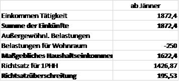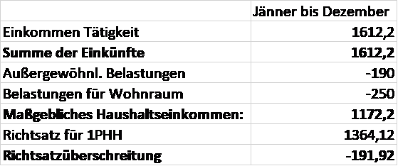 Da die Befreiungen im Dezember 2023 beantragt wurden, ist der nächstmögliche Gebührenbefreiungszeitraum ab Jänner 2024. Folgende Berechnungen konnten anhand der festgestellten Einkünfte erstellt werden:
