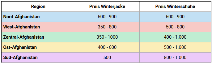 Mit Stand Februar 2024 kosten eine Busfahrt von Kabul nach Mazar-e Sharif 850 AFN und ein Taxi 1.300 AFN (IOM 22.2.2024). Im Dezember 2024 gab eine weitere Quelle an, dass eine Fahrt von Kabul nach Mazar-e Sharif mit einem Premiumbus 1.200 AFN kosten würde. Der Preis für einen normalen Bus wird mit 700 AFN angegeben, während ein Taxi 1.000 AFN kosten würde. Zwischen Kabul und Herat kostet ein Premiumbus zwischen 2.000 und 2.200 AFN, ein normaler Bus zwischen 1.500 bis 1.700 AFN und ein Taxi 2.800 AFN pro Person (RA KBL 4.12.2024).