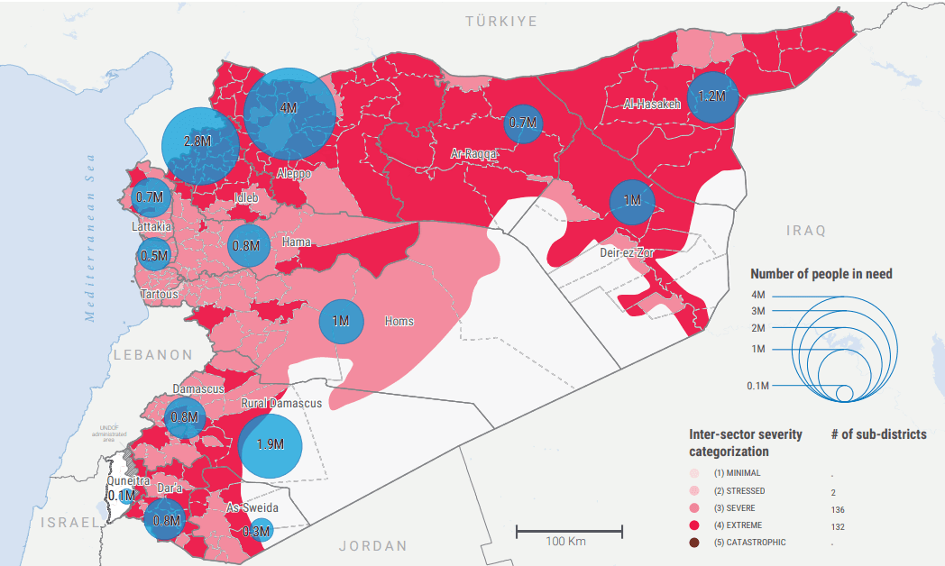 Im Nordwesten Syriens ist die Gesundheitskrise von erheblichen Herausforderungen geprägt (WHO 27.12.2024). Gesundheitspartner schlagen Alarm wegen schwerer Treibstoffknappheit im Manbij National Hospital, das etwa 100.000 Menschen versorgt. Das Krankenhaus ist seit mehreren Tagen vollständig auf Generatoren angewiesen, um Dialysegeräte, Brutkästen für Neugeborene und andere lebensrettende Geräte auf der Intensivstation und in den Operationssälen zu betreiben. Die Nierenabteilung des Krankenhauses musste ihre Dienste aufgrund des kombinierten Mangels an Strom und Treibstoff vollständig einstellen. Im Nordosten Syriens sind die mobilen medizinischen Einheiten mit einem Personalmangel konfrontiert, während die Sorgen um die psychische Gesundheit von Kindern, die in Sammelunterkünften Anzeichen von psychischem Stress zeigen, zunehmen (UNOCHA 7.1.2025). Blutbanken sind einem kritischen Risiko ausgesetzt, da fünf von elf Blutversorgungseinrichtungen ihre Mittel aufgebraucht haben. Tuberkulosezentren sind in ähnlicher Weise betroffen, da eines von vier seinen Betrieb eingestellt hat. Darüber hinaus sind vier von 16 Dialysezentren nicht in Betrieb, was sich auf Patienten mit chronischen Nierenerkrankungen auswirkt (WHO 27.12.2024). Die höchste Prävalenz von Menschen mit Behinderungen ist im Bezirk Nord-Aleppo zu verzeichnen, wo 63 % der Gesamtbevölkerung (ab zwei Jahren) Schwierigkeiten bei der Ausführung alltäglicher Aufgaben haben oder eine Art von Behinderung aufweisen. Darüber hinaus haben 59 % der Menschen in Nord-Aleppo Schwierigkeiten bei der Ausführung alltäglicher Aufgaben oder Behinderungen, gefolgt von 58 % in Idlib. Gemäß Studie der Assistance Coordination Unit in Nordsyrien ist in allen Regionen, die in dieser Studie erfasst wurden, die Prävalenz von Behinderungen bei Frauen höher als bei Männern. Die Rate von Behinderungen ist bei älteren Menschen wahrscheinlich höher, unabhängig vom Geschlecht. Die Ergebnisse sind besorgniserregend, da Menschen, insbesondere Menschen mit Behinderungen, seltener Zugang zu ausreichender Beschäftigung haben und eher von Familienmitgliedern abhängig sind. Ebenso geben Haushalte mit einem behinderten Mitglied nur halb so häufig an, über ein ausreichendes Einkommen zu verfügen, um ihre Bedürfnisse zu decken. Die Fähigkeit, eine humanitäre Krise zu überleben, hängt sowohl mit der Gesundheit, einschließlich der psychischen Gesundheit, als auch mit der finanziellen Sicherheit zusammen, die mit zunehmendem Alter immer unwahrscheinlicher werden. Auch die chronisch hohe Rate von Kindern mit Behinderungen ist besorgniserregend. 18 % der Menschen in Nordsyrien haben Probleme beim Gehen oder Klettern. 17 % der Menschen in Nordsyrien haben Sehprobleme, selbst wenn sie eine korrigierende Sehhilfe verwenden. 8 % der Menschen in Nordsyrien haben Hörprobleme, selbst wenn sie Hörgeräte verwenden. 11 % der Menschen in Nordsyrien haben Schwierigkeiten, einen Behälter mit zwei Litern Wasser von der Hüfte auf Augenhöhe zu heben. 12 % der Menschen in Nordsyrien haben Schwierigkeiten, sich selbst zu versorgen, einschließlich des Badens oder Anziehens. 8 % der Menschen in Nordsyrien haben Schwierigkeiten bei der Kommunikation, z. B. beim Verstehen oder Verstandenwerden in der Alltagssprache (Slang). 17 % der Menschen in Nordsyrien haben Schwierigkeiten beim Erinnerungsvermögen oder bei der Konzentration. 23 % der Menschen in Nordsyrien haben kognitive Schwierigkeiten. 15 % der Menschen in Nordsyrien haben Schwierigkeiten, ihr Verhalten zu kontrollieren. 16 % der Menschen in Nordsyrien haben Schwierigkeiten, eine neue Beziehung aufzubauen. 26 % der Menschen in Nordsyrien leiden unter ständiger Angst. 28 % der Menschen in Nordsyrien leiden unter anhaltender Traurigkeit. 13 % der Schwierigkeiten oder Behinderungen waren auf Krieg oder terroristische Aktivitäten zurückzuführen. 3% wurden durch Misshandlung (physisch und psychisch) verursacht. 1 % wurden durch Naturkatastrophen verursacht, wobei Erdbeben am häufigsten waren (ACU 27.11.2023).