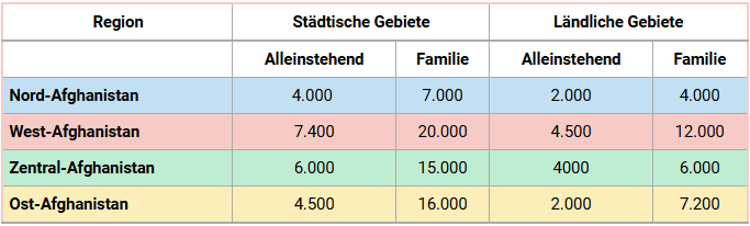 Nach Angaben von IOM (Stand Februar 2024) liegt der durchschnittliche Tageslohn in Kabul zwischen 300 und 500 AFN, was die vielfältigen wirtschaftlichen Gegebenheiten und Möglichkeiten in der Hauptstadt widerspiegelt. Für Herat gibt der Bericht an, dass der durchschnittliche Tageslohnempfänger eine etwas geringere Spanne von 250 bis 350 AFN erhält. In Mazar-e Sharif schließlich liegt der durchschnittliche Tageslohn bei 200 AFN. Diese Unterschiede bei den Tageslöhnen in den einzelnen Städten verdeutlichen die lokalen wirtschaftlichen Bedingungen, die Faktoren wie die Zusammensetzung der Industrie, die Nachfrage nach Arbeitskräften und die regionale wirtschaftliche Entwicklung umfassen und ein differenziertes Verständnis der wirtschaftlichen Widerstandsfähigkeit in den verschiedenen städtischen Zentren ermöglichen (IOM 22.2.2024). Laut IOM blieben diese Beträge mit September 2024 aktuell (IOM 17.9.2024). Im Juli 2024 berichtet das World Food Programme (WFP), dass die Löhne für gelernte und ungelernte Arbeiter gestiegen sind. So verdient ein ungelernter Arbeiter im Schnitt 317 AFN pro Tag, während das Durchschnittsgehalt eines gelernten Arbeiters 655 AFN beträgt (WFP 11.7.2024). Das erwartete monatliche Durchschnittseinkommen für ungelernte Vollzeitarbeiter liegt mit Juli 2024 bei 3.362 AFN, womit nur 64 % des Warenkorbs des WFP (5.232 AFN) finanziert werden können (WFP 12.8.2024).