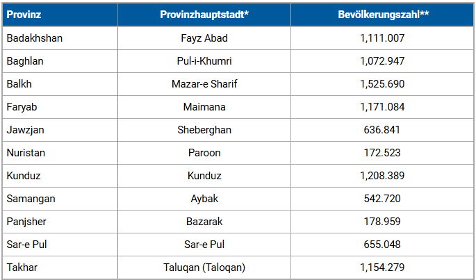 Im Norden Afghanistans beginnt die zentralasiatische Steppe - grasbewachsene Ebenen, die bis nach Russland reichen. Bis zur Fertigstellung des Salang-Tunnels Mitte der 1960er-Jahre war diese Region durch den Hindukusch vom übrigen Afghanistan relativ isoliert. Mazar-e Sharif ist die größte Stadt in Nord-Afghanistan. In der Region leben u. a. viele Usbeken, Tadschiken und Turkmenen (NPS o.D.b). In der nördlichen Region Afghanistans gibt es kalte, trockene Winter mit mäßigem Schneefall und heiße, trockene Sommer (IOM 2.12.2024).