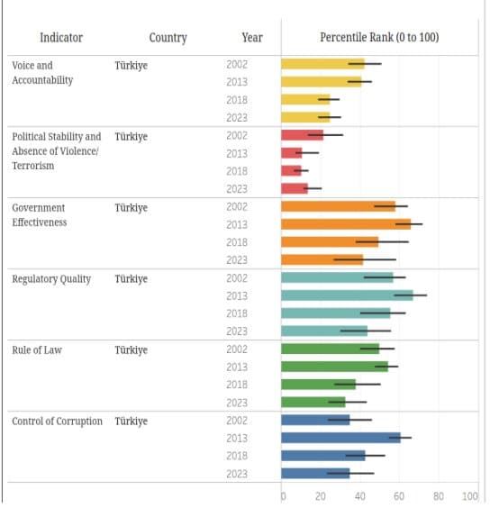 Interpretation: In den ersten Jahren nach der Machtübernahme der AKP haben sich die Indikatoren deutlich verbessert. In den letzten zehn Jahren haben sie sich, bis auf die Dimension: "Politische Stabilität und Abwesenheit von Gewalt/Terrorismus", allesamt wieder verschlechtert und liegen zum Teil unter dem Niveau von 2002.