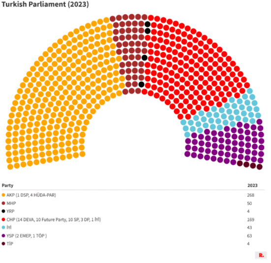 Bei den gleichzeitig mit der ersten Runde der Präsidentschaftswahl stattgefundenen Parlamentswahlen erhielt die "Volksallianz" unter Führung der AKP mit 49 % der Stimmen eine absolute Mehrheit der 600 Parlamentssitze. - Die AKP gewann hierbei 268 (35,6 %), die ultranationalistische MHP 50 (10,1 %) und die islamistische Neue Wohlfahrtspartei - Yeniden Refah Partisi (YRP) fünf Sitze (2,8 %). Das Oppositionsbündnis "Allianz der Nation" unter der Führung der säkularen, sozialdemokratisch ausgerichteten CHP erlangte 35 %, wobei die CHP 169 (25,3 %) und die nationalistische İYİ-Partei 43 Sitze (9,7 %) errang. Aus dem Bündnis mehrerer Linksparteien unter dem Namen "Arbeit und Freiheitsallianz" schafften die Links-Grüne Partei - Yeşil Sol Parti (YSP) mit künftig 61 (8,8 %) und die "Arbeiterpartei der Türkei" -Türkiye İşçi Partisi (TİP) mit vier Abgeordneten den Sprung ins Parlament (TRT 2023; vgl. BBC 22.5.2023).