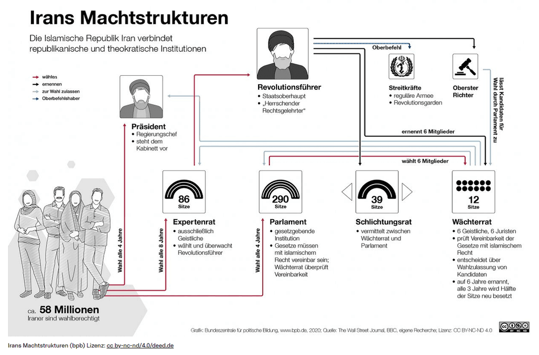DW - Deutsche Welle (20.6.2025): Iran's complex political and military power structure, https://www.dw.com/en/irans-complex-political-and-military-power-structure/a-72976165, Zugriff 3.7.2025