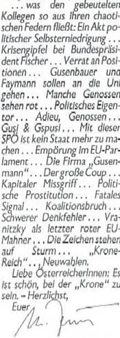 Die Parteien stehen im Wettbewerb auf dem österreichischen Markt für Tageszeitungen. Die Beklagte veröffentlichte vor der Nationalratswahl 2008 einen an ihren Herausgeber gerichteten Brief des (damaligen) Bundeskanzlers und des Vorsitzenden der SPÖ zu deren zukünftiger Haltung gegenüber der Europäischen Union. Dieser Brief wurde in anderen Medien heftig kritisiert. Die Beklagte replizierte darauf unter der Rubrik „Post von Jeannée“ wie folgt: