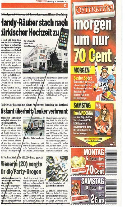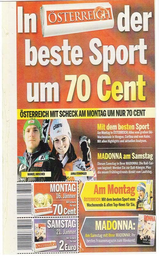 Am Sonntag den 4. 12. 2011 veröffentlichte die Beklagte auf Seite 17 der Innenausgabe von „Österreich“ die auf dem folgenden Bild ersichtliche Ankündigung „ Österreich morgen um nur 70 Cent“, wobei es sich bei den abgebildeten Sportlern um Benni Raich und Elisabeth Görgl handelt. Am Sonntag den 15. 1. 2012 veröffentlichte sie auf Seite 30 der Innenausgabe ihrer Tageszeitung die auf dem zweitfolgenden Bild ersichtliche Ankündigung „In Österreich der beste Sport um 70 Cent“. Bei den dort abgebildeten Sportlern handelt es sich um Anna Fenninger und Marcel Hirscher.