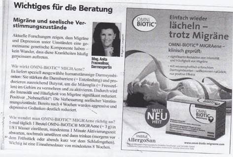 Am 19. 9. 2015 warb die Beklagte im wöchentlich erscheinenden Frauenmagazin „Madonna“ mit den Aussagen „Einfach wieder lächeln – trotz Migräne“ . „OMNi BiOTiC MIGRAene reduziert Intensität und Häufigkeit von Migräne natürlich aus dem Bauch heraus – ohne unerwünschte Effekte“.