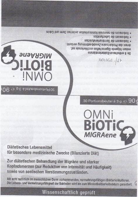 Neben dem Produktnamen „OMNi BiOTiC MIGRAene“ sind unter anderem folgende Informationen aufgedruckt: „Diätetisches Lebensmittel für besondere medizinische Zwecke (Bilanzierte Diät). Zur diätetischen Behandlung von Migräne und starker Kopfschmerzen (zur Reduktion von Intensität und Häufigkeit) sowie von seelischen Verstimmungszuständen.“