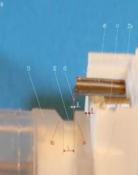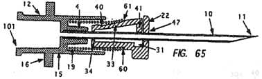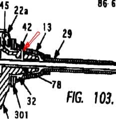 Im Zuge des Erteilungsverfahrens wurde das Kennzeichen des Anspruches insofern präzisiert, als nicht mehr der gesamte Kopplungsmechanismus(g) des Anspruchs 1 als kennzeichnender Teil ausgewiesen wurde, sondern nur mehr das Merkmal, wonach der Vorsprung (42) des distalen Endes des Arms (45) lösbar in einer Ausnehmung (32) des Katheteransatzes (13) gehalten wird. Zu Merkmalen d, e: Eine bevorzugte Ausführungsform der Erfindung im seitlichen Querschnitt ist in den Figuren 103 bis 105 der Patentschrift wie folgt dargestellt: