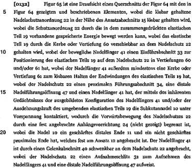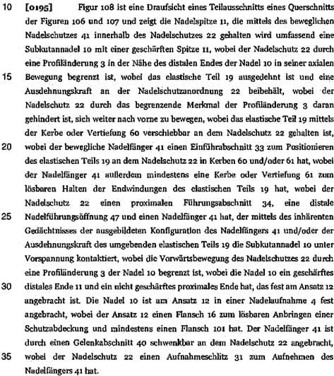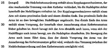 Das Merkmal e) („wobei sich der Nadelfänger des Nadelschutzes über das spitze distale Ende der Nadel vorwärts bewegt und dadurch das spitze distale Ende abdeckt, wenn der Nadelschutz nach vorne in die Nähe des spitzen distalen Endes der Nadel gedrückt wird“) definiert die Richtung der „Vorwärtsbewegung“ des Nadelfängers nicht. Ob die Vorwärtsbewegung nun normal zur Nadelachse geschieht oder parallel dazu ist daher unerheblich, solange sie zur Abdeckung des Nadelendes führt.