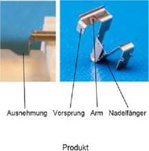 Wie bereits zu Merkmal d) ausgeführt, können die Schenkel der Vorspannfeder als Teil des Nadelfängers angesehen werden. An einen dieser Schenkel schließt sich ein (abgewinkelter, lang gestreckter) Teil an, der an der am weitesten vom Schenkel entfernten Stelle einen Vorsprung aufweist, der lösbar mit dem Katheteransatz gehalten wird.