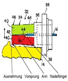 Im Gegensatz zu der im Revisionsrekurs vertretenen Meinung weist die Nadelschutzvorrichtung von D1 keinen Arm im Sinne des Streitpatents auf. Beide Finger 34 – der obere und der untere – bilden den Nadelfänger 32 (tip guard) und keinen Arm, die Fortsätze 46 entsprechen dem Vorsprung (42) des Streitpatents. Um dem Streitpatent zu entsprechen, müsste zwischen diesen beiden Bauteilen ein sich in Längsrichtung der Nadelschutz-vorrichtung erstreckender Arm befinden. Ein solcher fehlt jedoch. Der Meinung, dass der in der farbigen Figur markierte Absatz ein Nadelfänger sei, wird nicht beigetreten.
