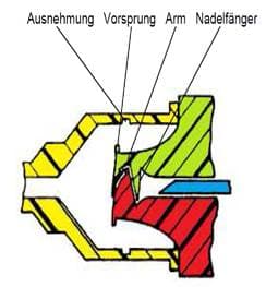 In dieser Position schlägt die Spitze (11) der Nadel (10) am Nadelfänger (41) an und kann nicht mehr darüber hinaustreten. In dieser Stellung wird die Nadelspitze (11) durch die am beweglichen Schenkel der Vorspannfeder (F) angebrachte Lasche abgedeckt.