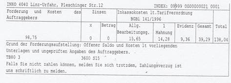 Die verrechneten Inkassokosten werden aus dem Titel des Schadenersatzes begehrt. Ich (Wir) verpflichte(n) mich (uns), die vorgenannte Schuld in Teilbeträgen lt. tieferstehendem Tilgungsplan monatlich zu zahlen. Zahlungen können zuerst auf Inkassokosten und dann auf Gläubigerforderung und Zinsen verrechnet werden.
