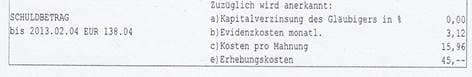 [2] Ich (Wir) anerkenne(n) hiermit ausdrücklich die unten aufgeschlüsselte Forderung zuzüglich der noch auf die Dauer der sich ergebenden Laufzeit zu errechnenden Evidenzkosten und Zinsen.