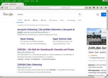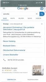 [2] Die Beklagte befasst sich ebenfalls mit Schaufensterdekorationen und visual merchandising und betreibt einen unter http://www.d*****.at/ erreichbaren Online-Shop. Sie hat jedenfalls seit Sommer 2019 beim entgeltlichen Referenzierungsdienst „AdWords“ von Google das Keyword „Zaruba“ erworben, was dazu führte, dass bei Eingabe dieses Suchbegriffs bei Google auf Desktop bzw (teilweise) auf mobilen Endgeräten folgende Ergebnisse erschienen: