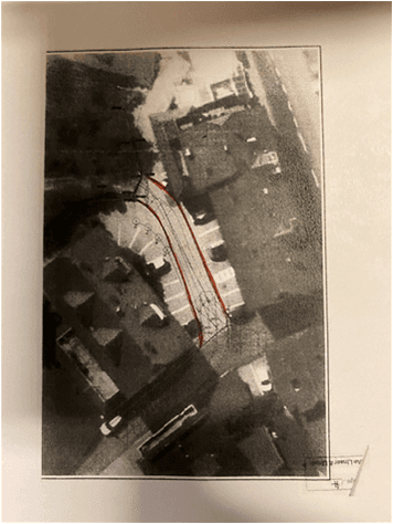 [4] Die Situation stellt sich wie folgt dar (Beil ./H, der Verlauf der Dienstbarkeitstrasse ist in rot hervorgehoben; im Norden [] verläuft der „Feldweg“, die Zufahrt zum Grundstück des Klägers setzt sich am Ende der farblich hervorgehobenen Fläche im Wesentlichen in Richtung Osten fort):