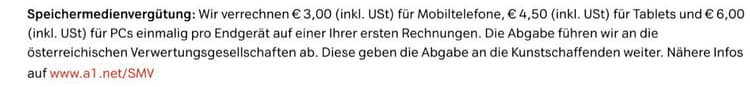 [9] Hier erwähnte die Beklagte erstmals eine „Speichermedienvergütung“ in Höhe von drei EUR für das gegenständliche Telefon. Die Beklagte verrechnete diese Kosten („Speichermedienvergütung“ und „Mobile Service Pauschale“) bei allen Kombinationsangeboten aus Mobiltelefon samt Tarif sowie auch bei allen selbständig angebotenen Mobiltelefonmodellen oder Tarifen zusätzlich zu den behaupteten Gesamtkosten. Sie verrechnete die Mobile-Service-Pauschale in Höhe von jährlich 21,90 EUR zB auch bei günstigeren Tarifen mit und ohne Telefonmodell (zB beim Tarif „A1 Easy-SIM S“ ohne Mindestvertragsdauer zum Preis von 17,90 EUR monatlich) und die Speichermedienvergütung in Höhe von drei EUR auch bei günstigeren Telefonmodellen mit und ohne Tarif (zB beim Telefonmodell Xiaomi Mi 8 zum Kombinations Preis von 0,00 EUR im Tarif „A1 Go! L“).