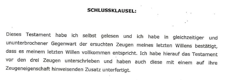 [2] Danach folgen die Angabe von Ort und Datum, die handschriftliche Nuncupatio des Erblassers und dessen Unterschrift sowie die Unterschriften der drei Testamentszeugen samt handschriftlichem Zeugenzusatz.