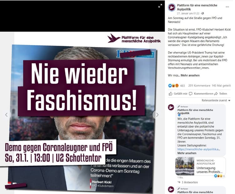 [6] Herbert Kickl habe am 26. 1. 2021 in seinem Facebook-Auftritt angekündigt, am Sonntag, den 31. 1. 2021, an einer Demonstration unter dem Titel „Für Freiheit, gegen Zwang, Willkür, Rechtsbruch“ teilzunehmen. Die Veranstalter hätten die Bevölkerung hinsichtlich der Gefahr des Erodierens von Grund- und Freiheitsrechten empfindlich machen wollen. Vehement bestritten werde, dass es sich dabei um eine Demonstration der „Corona-Leugner“ gehandelt habe. Zu keiner Zeit sei von Herbert Kickl ein Aufruf gegen den Parlamentarismus gestartet worden. Die Veröffentlichung der beklagten Partei stelle sich als völlig verfehlte Entgegnung dar. Es sei auch nicht einzusehen, wie die beklagte Partei aus der Ankündigung des Klubobmanns, ein zentrales politisches Grundrecht der Demokratie, das Versammlungsrecht, auszuüben, den Bezug zum Faschismus herstelle. In Wahrheit versuche die beklagte Partei die klagende Partei und deren Klubobmann unter dem Deckmantel vermeintlich zulässiger Kritik auf besonders verwerfliche Art und Weise zu schädigen.