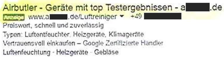[3] Nachdem der Kläger immer wieder gegen Fremdfirmen vorgegangen war, die seine Marke zu Werbezwecken verwendet hätten, suchte er am 11. 10. 2016 auf google.at und google.de wieder unter dem Begriff „AIRBUTLER“. Bei dieser Suche schienen je vier Einträge auf, die mit „Anzeige“ gekennzeichnet waren, darunter folgende Anzeige mit Webadresse und Telefonnummer der Beklagten: