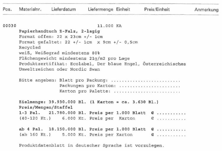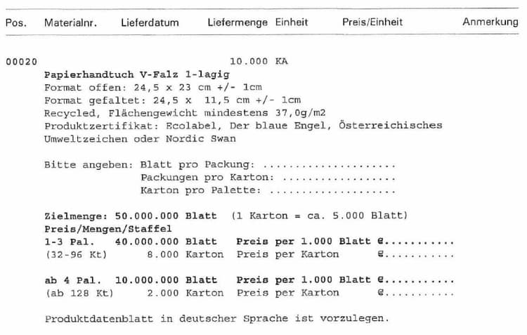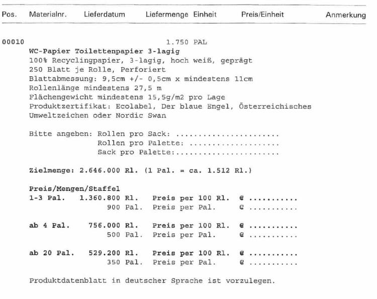 Im Rahmen einer aktuellen konzerninternen Bedarfserhebung hat sich ergeben, dass für das gegenständliche Hygienepapier nicht bei allen gemäß § 189 Z 8 UGB mit der Ö * AG verbundenen Unternehmen ein Beschaffungsbedarf besteht, sondern nur jedenfalls bei der * AG und möglicherweise bei einer weiteren Konzerngesellschaft.