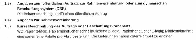 1. In der […] veröffentlichten Auftrags-bekanntmachung ist […] nicht angeführt, dass die Abnahme einer Mindestmenge erfolgt. Nunmehr hat sich der Bedarf einer Mindestabnahmemenge ergeben.