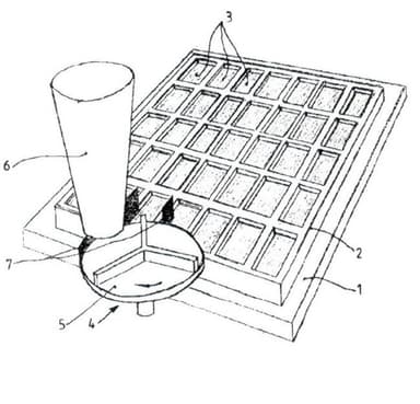 [0034] In der einzigen Figur ist mit 1 ein Formbrett bezeichnet, auf dem eine mit 2 bezeichnete Form angeordnet. Die Form 2 weist eine größere Anzahl von durchgehenden Öffnungen (35 Stück in der Figur) auf, in denen Beton eingefüllt ist, auf dem eine mit 3 bezeichnete Vorsatzbetonschicht aufgebracht und sichtbar ist. Die Vorsatzbetonschicht ist, der Figur nicht entnehmbar, eingefärbt. Weiterhin ist mit 4 allgemein eine Aufbringvorrichtung bezeichnet, die eine mit 5 bezeichnete Schleuderscheibe beinhaltet. Die Ebene der Schleuderscheibe ist etwa parallel zur Oberfläche der Form 2 mit Abstand zu dieser ausgerichtet. Die Aufbringvorrichtung 4 kann sich entlang der in der Figur angeordneten Seite aber auch entlang der übrigen Seiten der Form bewegen, so dass alle Vorsatzbetonschichten 3 beliebig erreicht werden können. Oberhalb der Schleuderscheibe 5 ist ein mit 6 bezeichneter Trichter angeordnet, in dem, nicht sichtbar, Veredelungsmaterial eingefüllt ist. Der Trichter 6 hat an seinem der Schleuderscheibe 5 zugewandten Ende (nicht sichtbar) eine Vorrichtung zum Öffnen und Schließen der Trichteröffnung, so dass beliebige Portionen des Veredelungsmaterials auf die Schleuderscheibe geleitet werden können. Es können oberhalb der Schleuderscheibe mehrere Trichter angeordnet sein, in denen unterschiedliche Veredelungsmaterialien enthalten sind, um die Oberflächen der Vorsatzbetonschichten 3 mit verschiedenen Veredelungsmaterialien in verschiedenen Dosierungen bewerfen zu können. Auch die Drehzahl der Schleuderscheibe 5 und dessen Höhenlage zu der Form 2 kann beliebig verstellt und variiert werden, auch während der Wurfbewegung, ebenso die Bewegungsgeschwindigkeit entlang der Form.