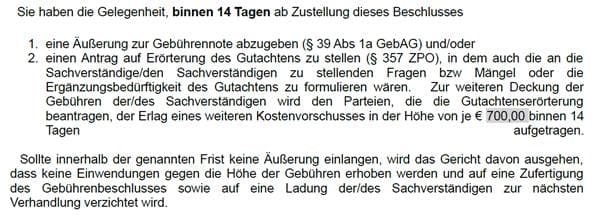 Die Beklagte hat in ihrer darauffolgenden Eingabe ON 16 nicht nur ihre Zustimmung zur Gebührenbemessung in der begehrten Höhe erteilt, sondern auch von der eingeräumten Möglichkeit Gebrauch gemacht und einen Fragenkatalog an den Sachverständigen formuliert.