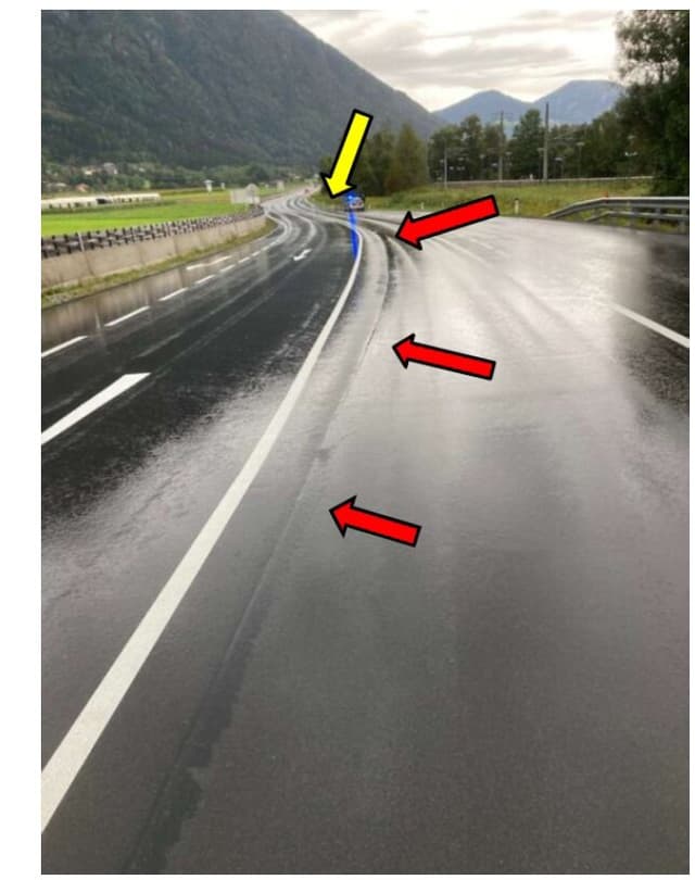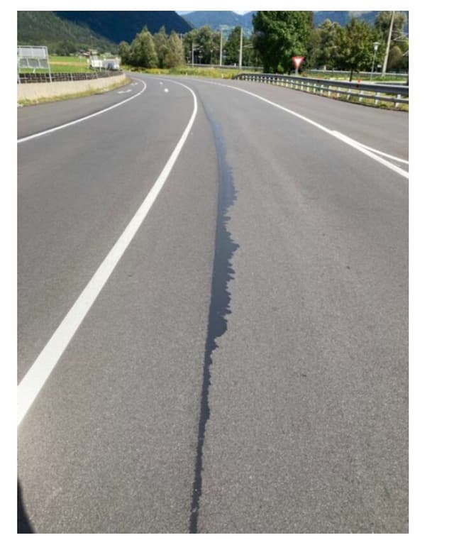 • der im Unfallbereich vorhandene Bitumenstreifen spätestens Ende Juni 2022 bereits bis zu 12 cm Breite erreicht hat, was etwa der Breite der Mittellinie entspricht,