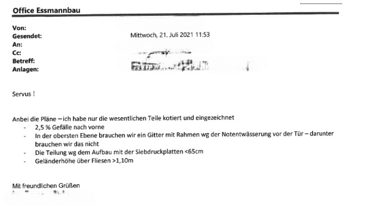 Noch im Juli 2021 wünschte die Klägerin eine Systemänderung dahingehend, dass nicht ein Gitterrost errichtet, sondern Fliesen verlegt werden sollten. Die Beklagte verfasste daraufhin das Email vom 21.07.2021, welches an die Firma C* und in Cc an die Klägerin geschickt wurde.