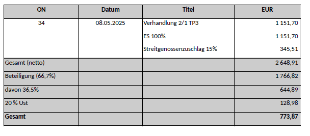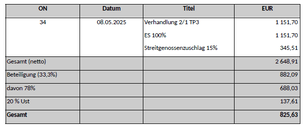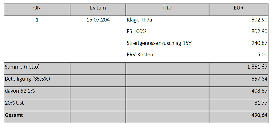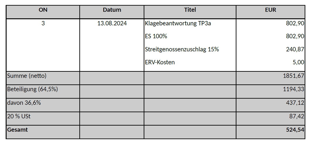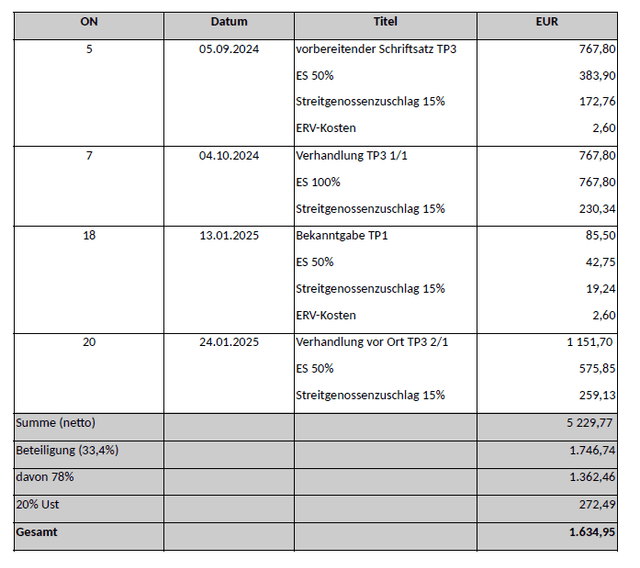 2.7. Die Zweitklägerin hat daher den Beklagten ihre mit EUR 3.410,20 (darin enthalten EUR 568,37 USt) bestimmten Prozesskosten (214,98 + 2.344,16 + 282,69 = 2.841,83 zuzüglich 20 % USt) zu ersetzen, während die Beklagten gegenüber der Zweitklägerin mit EUR 329,20 an (saldierten) anteiligen Barauslagen ersatzpflichtig sind.