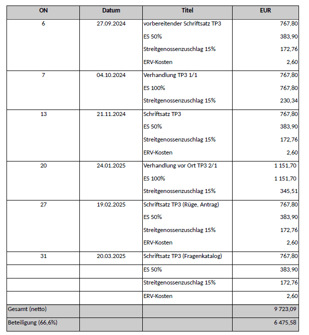2.3. Im zweiten Verfahrensabschnitt (vorbereitender Schriftsatz vom 5. September 2024 - vorbereitender Schriftsatz vom 5. Mai 2025) ist die Zweitklägerin bei einem (fiktiven) Streitwert von EUR 18.273,19 (a. bis c., e. und f. wie im ersten Verfahrensabschnitt, d. nunmehr EUR 511,00, zuzüglich g. EUR 52,19, Feststellung: EUR 5.000,00) mit EUR 7.628,25 (a. bis f. wie im ersten Verfahrensabschnitt zuzüglich g. EUR 52,19, ergibt EUR 11.442,37; davon 2/3), das sind rund 42 %, durchgedrungen. Nach der saldierten Erfolgsquote hat die Zweitklägerin den Beklagten in diesem Verfahrensabschnitt 16 % der anteiligen Prozesskosten zu ersetzen. Die Bemessungsgrundlage für beide Kläger beträgt in diesem Verfahrensabschnitt EUR 27.437,65 (Erstkläger: EUR 9.164,46; c. nunmehr EUR 2.064,46 statt EUR 2.964,46), die Beteiligung der Zweitklägerin daher 66,6 %. Das Erstgericht hat die in diesem Verfahrensabschnitt anerlaufenen Kosten der Beklagten in US 42f auf Basis der Bemessungsgrundlage von EUR 27.437,65 richtig mit EUR 9.723,09 netto berechnet. Unter Berücksichtigung der Beteiligung von 66,6 % und der gekürzten Obsiegensquote von 16 % errechnen sich die ersatzfähigen Kosten der Beklagten in diesem Verfahrensabschnitt mit EUR 2.344,16 netto .