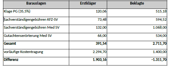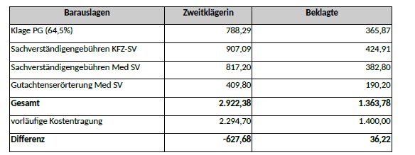 2.6. Im zweiten und dritten Verfahrensabschnitt, in denen die Zweitklägerin jeweils mit 42 % obsiegt hat, sind Kfz-Sachverständigengebühren iHv EUR 2.000,00 und med.SV-Gebühren iHv EUR 3.600,00 anerlaufen. Diese wurden je zur Hälfte von den Klägern und den Beklagten - somit iHv je EUR 1.800,00 - getragen und aus ihren Kostenvorschüssen zur Auszahlung gebracht. Die Kostenvorschussreste von je EUR 200,00 wurden rücküberwiesen (vgl ON 21 und ON 38). Geht man mangels eines sonstigen Anhaltspunktes von einer Einzahlung des Kostenvorschusses von EUR 1.800,00 durch die Kläger je zur Hälfe aus, hat die Zweitklägerin EUR 900,00 dieser Kosten getragen. Unter Berücksichtigung der ungekürzten Obsiegensquote von 42 % errechnet sich eine Ersatzpflicht der Beklagten gegenüber der Zweitklägerin betreffend die Sachverständigengebühren mit EUR 378,00. Demgegenüber beträgt die Ersatzpflicht der Zweitklägerin gegenüber den Beklagten (unter Berücksichtigung, dass EUR 900,00 betreffend die Zweitklägerin einbezahlt wurden) und der ungekürzten Obsiegensquote von 58 % betreffend die Sachverständigengebühren EUR 522,00 . Der Saldo zu Gunsten der Beklagten errechnet sich mit EUR 144,00 .