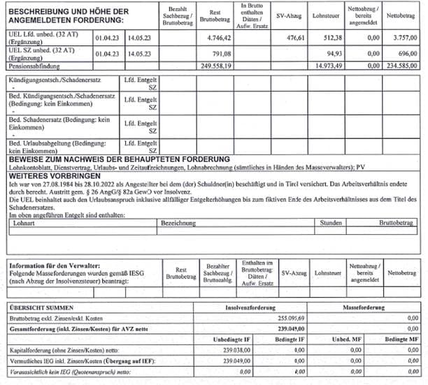 Am 22.2.2023 meldete der Kläger, vertreten durch einen Mitarbeiter der ISA Tirol (Insolvenzschutzverband, Arbeiterkammer Tirol), im Konkursverfahren eine Forderung beinhaltend auch eine „Pensionsabfindung“ von netto EUR 234.585,00 wie folgt an: