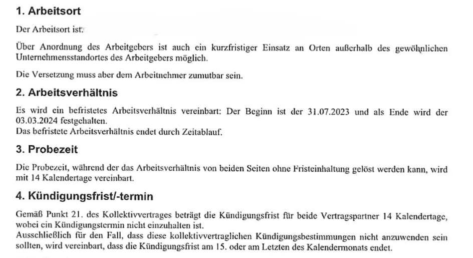 Der Arbeitsbeginn war am 7.5.2024; die Unterfertigung des Arbeitsvertrags erfolgte nach der Aufnahme der Arbeitstätigkeit. Der Arbeitsvertrag wurde nicht – wie dies am Arbeitsvertrag handschriftlich vermerkt ist – am 3.5.2024 unterfertigt, sondern nach Aufnahme der Arbeitstätigkeit am 7.5. oder 8.5.2024. Die Vertragsunterfertigung fand im Büro von D*, einem Sachbearbeiter im Personalwesen der Beklagten, statt. Bei dieser Gelegenheit konnte der Kläger den Vertrag erstmals einsehen. Den Arbeitsvertrag hatte die Lohnverrechnung der Beklagten erstellt. Vor der Unterfertigung des Vertrags durch den Kläger befanden sich darauf bereits die Unterschriften der Geschäftsführung und der Leitung Personalwesen. Das Treffen zwischen dem Kläger und D* dauerte nicht länger als fünf Minuten. (1) Ob D* gegenüber dem Kläger Punkt 4. des Vertrags thematisierte, kann nicht festgestellt werden . (2) Ob D* gegenüber dem Kläger im Allgemeinen die Themen „Kündigungsmöglichkeit“ und „Kündigungsfristen“ ansprach, kann nicht festgestellt werden .