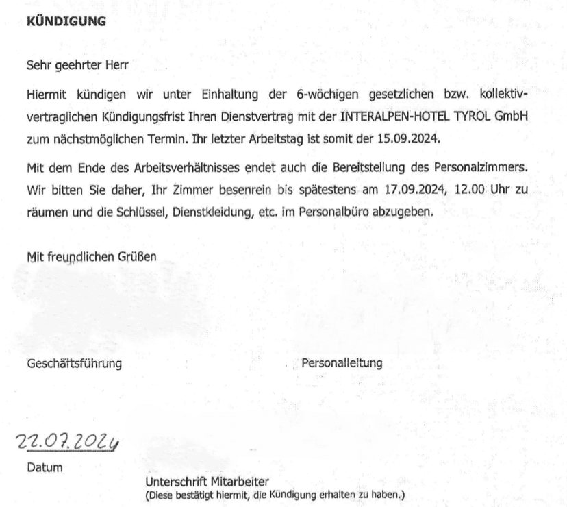 Am 22.7.2024 sprach die Beklagte gegenüber dem Kläger die Kündigung des Arbeitsverhältnisses zum 15.9.2024 mit folgendem Kündigungsschreiben aus: