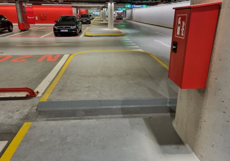 Der Kläger orientierte sich an den Überkopfwegweisern und den an den Wänden der Tiefgarage angebrachten Hinweisschildern „B*“ samt Richtungspfeil. Er ging zunächst auf der Fahrbahn der Tiefgarage, betrat in der Folge aber eine von ihm als Gehsteig wahrgenommene erhöhte Fläche, die in den an die Fahrbahn der Tiefgarage und die markierten Parkplätze angrenzenden Bereichen mit einer durchgehenden gelben Linie versehen war. Die Örtlichkeit stellt sich wie folgt dar