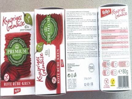 Zutaten: Mehlmischung (Maisstärke, Glukosesirup, Kartoffelflocken, Apfelfaser) 14 % Rote Rübe (Pulver), Kokosöl, Kren (Pulver), Salz, Emulgator (Lecithin), Backtriebmittel (Natriumhydrogencarbonat).